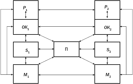 S1 и S2 – стороны конфликта (субъекты конфликта); П – предмет конфликта; ОК1 и ОК2 – образы предмета конфликта (конфликтной ситуации); М1 и М2 – мотивы конфликта; Р и Р2 – позиции конфликтующих сторон.