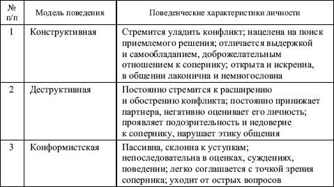 В литературе выделяют три основные модели поведения личности в конфликтной ситуации: конструктивную, деструктивную и конформистскую (табл. 5.1). Каждая из этих моделей обусловлена предметом конфликта, образом конфликтной ситуации, ценностью межличностных отношений и индивидуально-психологическими особенностями субъектов конфликтного взаимодействия. Модели поведения отражают установки участников конфликта на его динамику и способ разрешения.