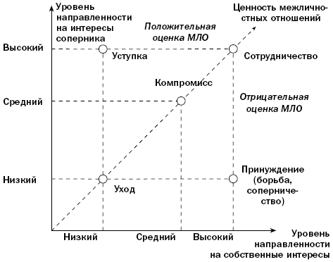 Особое место в оценке моделей и стратегий поведения личности в конфликте занимает ценность для нее межличностных отношений с противоборствующей стороной. Если для одного из соперников межличностные отношения с другим (дружба, любовь, товарищество, партнерство и т. д.) не представляют никакой ценности, то и поведение его в конфликте будет отличаться деструктивным содержанием или крайними позициями в стратегии (принуждение, борьба, соперничество). И, наоборот, ценность межличностных отношений для субъекта конфликтного взаимодействия, как правило, является существенной причиной конструктивного поведения в конфликте или направленностью такого поведения на компромисс, сотрудничество, уход или уступку.
