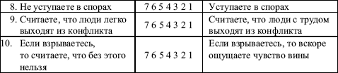 На каждой строке соедините отметки по баллам (отметки кружочками) и постройте свой график. Отклонение от середины (цифра четыре) влево означает склонность к конфликтности, а отклонение вправо будет указывать на склонность к избеганию конфликтов.