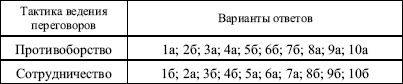 Если в вашем выборе преобладают ответы верхнего ряда таблицы, то в переговорах вы ориентированы на стремление во что бы то ни стало добиться победы, доказать свое. Такая тактика малоэффективна. Вам следует заняться самоанализом, ответив на вопрос: «Что мне мешает выбрать курс на сотрудничество в переговорах?»