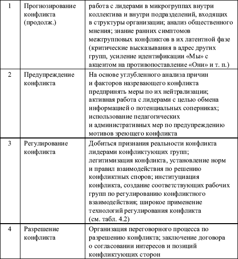 Содержание управления межгрупповыми конфликтами отражено в табл. 10.4.