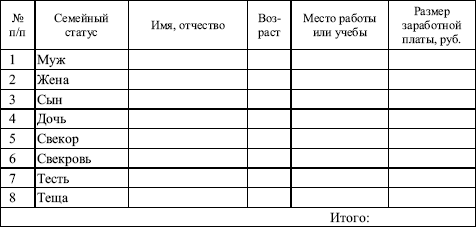 II этап (5–8 минут). Участники составляют характеристику семьи, обсуждая следующие вопросы: игровое имя и возраст каждого члена семьи; предполагаемое место работы (профессия, квалификация) или учебы, наличие пенсии; предполагаемый размер заработной платы (стипендии, пенсии) каждого члена семьи; возможные источники других доходов семьи (их размер и законность); итоговая сумма ежемесячного дохода семьи.