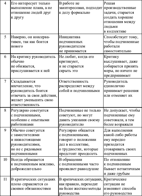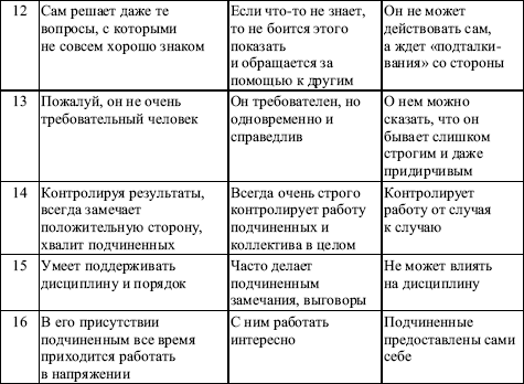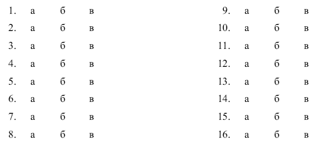 Инструкция. Опросник содержит 16 групп утверждений, характеризующих деловые качества руководителей. Каждая группа состоит из трех утверждений, обозначенных буквами «а», «б» и «в». Вам следует внимательно прочесть все три утверждения в составе каждой группы и выбрать то, которое в наибольшей степени соответствует вашему мнению о руководителе. Отметьте выбранное утверждение на опросном листе знаком «+» под соответствующей буквой.