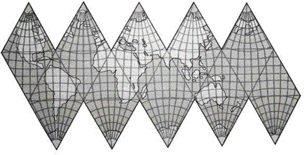 Примерно в то же время аналогичная идея пришла в голову выдающемуся экономисту из Йельского университета Ирвингу Фишеру: он задумал осуществить гномоническую проекцию поверхности Земли на 20 треугольных гранях икосаэдра (рис. 7.11). Икосаэдр является наиболее близким к идеалу многогранником для разрезания "на карты".