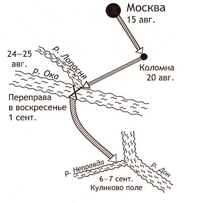 Обратите внимание на своеобразный «крюк» движения, который предпринял великий князь. Ставится вопрос: «Почему Дмитрий Иванович не повел свое ополчение прямо на Куликово поле? К сожалению, ни Н.М. Карамзин, ни В.О. Ключевский не объясняют нам замыслов великого князя. Лишь С.М. Соловьев пытался привести некоторые факты, которые могут пролить свет на загадочный крюк.