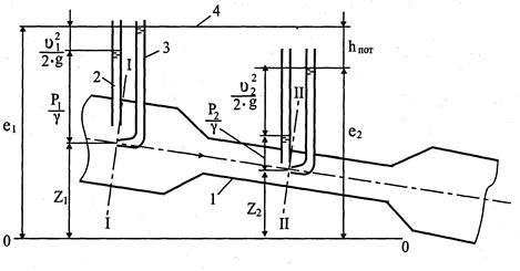 1 - поток; 2 - пьезометр; 3 - трубка Пито; 4 - линия полной энергии;