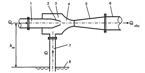 по трубопроводу 1 с соплом 2 на конце поступает в камеру всасывания 3, сообщенной всасывающим трубопроводом 7 с расходным резервуаром 8. Струя воды, вылетая из сопла 2 с большой скоростью, создает разрежение в камере всасывания 3 и соответственно во всасывающем трубопроводе 7. За счет вакуума из расходного резервуара 8 по всасывающему трубопроводу 7 подсасывается вода в количестве Q (расход эжектируемой – перекачиваемой жидкости).