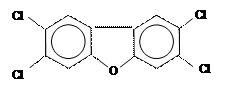 Структура 2,3,7,8-тетрахлордибензофурана (ТХДФ) также содержит два ароматических кольца, но связаны они одним кислородным мостиком: