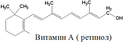 Жирорастворимый витамин А представляет собой циклический непредельный одноатомный спирт, состоящий из β–иононового кольца и боковой цепи из 2-х остатков изопрена и первичной спиртовой группы.