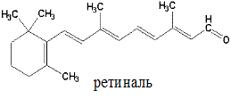 что синтез цис-ретиналя лишь частично протекает в сетчатке глаза, основное место его образования – печень. Кроме того, в сетчатке под действием специфической дегидрогеназы транс-ретиналь (альгид) превращается в транс-ретинол (спирт), который поступает в кровь, где соединяется с ретинолсвязывающим белком плазмы. Таким способом он доставляется в печень. В печени ретинолизомераза превращает транс-ретинол в цис-ретинол, последний с помощью NAD+-зависимой дегидрогеназы окисляется в цис-ретиналь, который также поступает в кровь. Этот комплекс улавливается пигментным эпителием сетчатки, и цис-ретиналь уже без участия ферментов связывается с опсином. Отсутствие регенерации родопсина приводит к слепоте в сумерках.