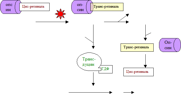 В сетчатке глаза имеются специализированные фоторецепторные клетки двух типов – палочки и колбочки. Наибольшей светочувствительностью обладают палочки, колбочки обеспечивают цветовое зрение. Наружные сегменты палочек содержат уплощенные замкнутые мембранные пузырьки – диски, уложенные в стопку. Диски богаты белком опсином. Опсин способен связываться с 11-цис-ретиналем, образуя пигмент пурпурно-красного цвета родопсин. Механизм образования зрительного сигнала достаточно хорошо изучен (см. рис.):