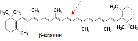 Впервые каротины были выделены из моркови, отсюда и их название (carota – морковь). α- и γ-каротины содержат по одному β-иононовому кольцу и при их окислительном распаде образуется 1 молекула витамина А, в молекуле β-каротина – два β-иононовых кольца и он обладает большей биологической активностью, поскольку из него образуется 2 молекулы ретинола: