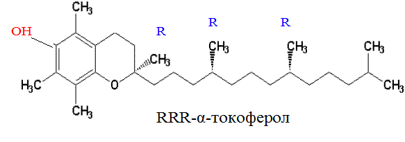 В 1938 г. токоферол, или витамин Е, был синтезирован химическим путём. Однако между природным и синтетическим витамином Е существуют различия, что отражено в их классификации. Натуральные формы токоферола обозначаются как RRR-альфа-токоферолы (R обозначает конфигурацию метильной группы) и имеют единственный стереоизомер; синтетические формы называются all-rac-альфа-токоферолы и являются рацемической смесью из 8 стереоизомеров, из которых 7 не найдено в природе. Основной биологически активной формой является RRR-α-токоферол:
