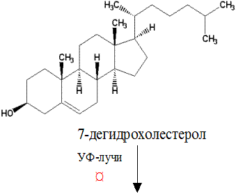 Наиболее важным из группы витаминов Д является витамин Д3 –холекальциферол. Холекальциферол образуется в качестве промежуточного продукта при биосинтезе холестерола (из 7-дегидрохолестерола) в клетках кожи человека под влиянием УФ-лучей.