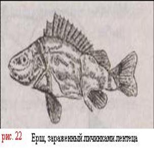 Рыба-щука, ерш, окунь, налим, форель (см. рис. 22), зараженная личиночной формой лентеца, является основным источником инвазии человека и животных. Личинки в виде белых червячков длиной 2-2,5 см виды невооруженным глазом под кожей, в мышцах и брющной полости рыбы.