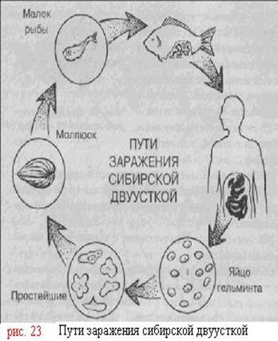 Вызывается проникновением в организм человека кошачьей двуустки (описторхиса), которая паразитирует в печени, желчном пузыре и поджелудочной железе человека, а также кошки, собаки и различных хищников, питающихся рыбой. Яйца описторхиса, попадая с фекалиями в водоемы, заражают моллюсков и развиваются в них до стадии церкариев (см. рис. 23). Поедая моллюсков, рыба заражается циркариями, которые в ее мышцах превращаются в метацеркариев.