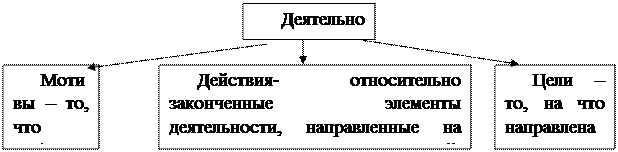 Целостная деятельность имеет следующие составляющие: потребности - мотивы - цели - условия достижения цели (единство цели и условий составляет задачу) и соотносимые с ними: деятельность - действия - операции.
