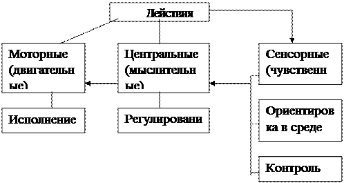 Действие имеет подобную деятельности структуру: цель — мотив, способ — результат. Различают действия: сенсорные (действия по восприятию объекта), моторные (двигательные действия), волевые, мыслительные, мнемические (действия памяти), внешние предметные (действия направлены на изменение состояния или свойств предметов внешнего мира) и умственные (действия, выполняемые во внутреннем плане сознания). Выделяют следующие компоненты действия: сенсорные (чувственные), центральные (мыслительные) и моторные (двигательные).
