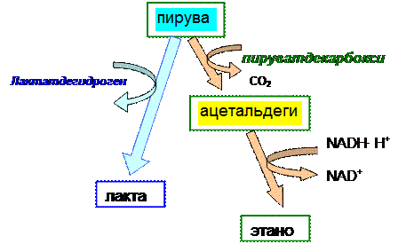 1. Участие ТПФ в реакции прямого декарбоксилирования пировиноградной кислоты (ПВК). При декарбоксилировании ПВК с помощью пируватдекарбоксилазы образуется ацетальдегид, который под воздействием алкогольдегидрогеназы превращается в этанол.ТПФ является незаменимым кофактором пируватдекарбоксилазы. Этим ферментом богаты дрожжи.