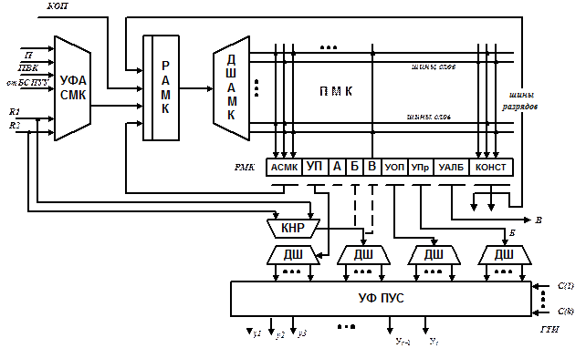 Кроме перечисленных структурных элементов УА содержит ряд коммутаторов и декодирующих схем, связанных с полями регистра РМК.