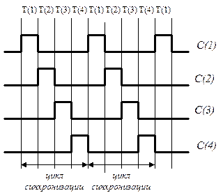 Покажем на рис. 2.3 пример 4-х-тактной синхронизации с помощью серий С(1) – С(4), задающих последовательность тактов Т(1) – Т(4).