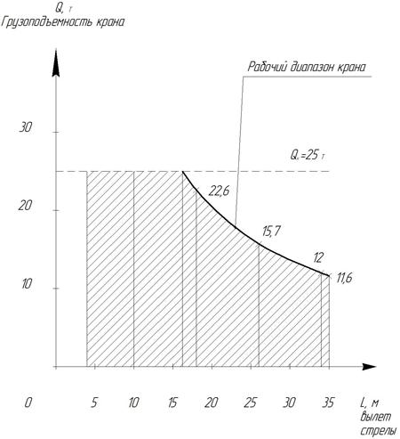 Грузовая характеристика крана – это график зависимости грузоподъемности от вылета cтрелы. При этом, в курсовом проекте принимают допущение, что грузовой момент на всех вылетах стрелы остается постоянным.