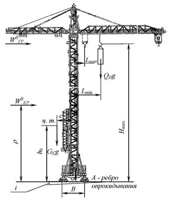 Рис. 12 – Расчетная схема грузовой устойчивости башенного крана с неповоротной башней и балочной стрелой