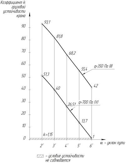 Рис. 13 – Зависимость коэффициента грузовой устойчивости крана КБ-674A0 от района строительства и уклона пути.