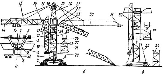 Проверяют работу грузовой лебедки, а также тяговых лебедок передвижения грузовой тележки и тележек противовеса здания. Затем устанавливают кабельный барабан, балласт и шкаф электрооборудования. К фланцам ходовой рамы крепят основание башни, монтируют лестницу, на основание башни устанавливают секцию башни в сборе. Затем освобождают оси балансирных балок, навешивают монтажную стойку, прижимая ее винтами к секции, регулируют положение роликов выдвижения башни.
