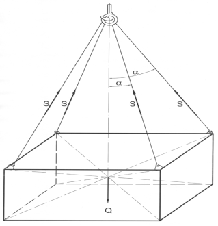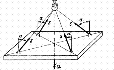 На крюке располагают кольцо стропа, к которому крепятся его ветви. С помощью крюков строп соединяют с петлями груза. Для приведения расчетной схемы в равновесие на каждую ветвь наносится вектор натяжения ветви стропа S.