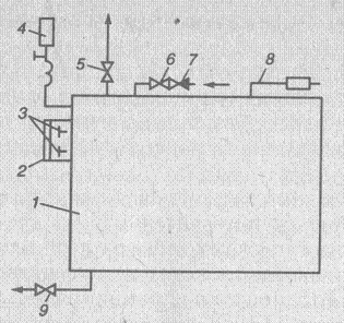 1 – котел; 2 – водоуказательное стекло; 3 – краны паровоздушные; 4 – манометр; 5 – вентиль паровоздушный; 6 – питательный вентиль; 7 – обратный клапан; 8 – предохранительный клапан; 9 – вентиль для спуска воды.