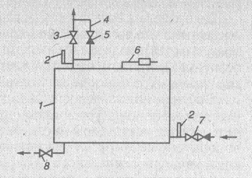 1 – котёл; 2 – термометр; 3 – вентиль водозаборный; 4 – обводная линия; 5 – обратный вентиль; 6 – предохранительный клапан; 7 – водоподводящий вентиль; 8 – вентиль спуска воды.
