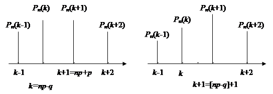 т.е. вероятности pn (k) монотонно возрастают. Соответственно, когда k > np - q, то верно неравенство pn (k+ 1) < pn (k) и вероятности pn (k) начинают монотонно убывать. Если число np – q – целое, то имеем два наивероятнейших числа: