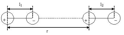 Рис. 3.2. Взаимодействие двух диполей, расположенных вдоль прямой линии (| r | >> l1, l2).