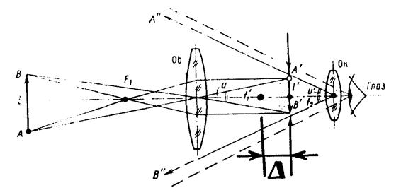 Действительное, обратное изображение предмета А'В' получают от объектива за его главным фокусом F. Окуляр устанавливается таким образом, чтобы его главный фокус f оказался впереди изображения А'В' (точки F и f почти совпадают). Тогда перед окуляром получается обратное изображение А"В", оно увеличенное, но мнимое и находится на расстоянии наилучшего зрения от глаза. В плоскости А'В' помещается сетка нитей.