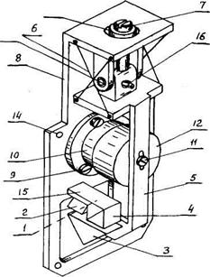 1 - объектив; 2 - фокусирующая линза; 3 - призма-компенсатор АР-60";4 - призма БкУ-60°; 5 - сетка нитей; 6 - окуляр; 7 — подвижные опоры;8 - бериллиевые нити; 9,15 – магнитоиндукционные демпфер (поз. 15 одновременно выполняет роль балансира); 10 - грузики; 11 - стопорный винт; 12 - маятник; 13 - винт; 14 - прокладка