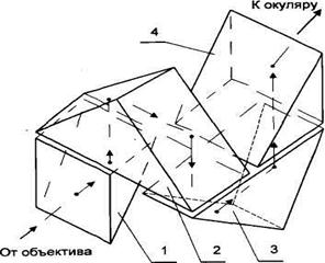1 - пентапризма; 2 - объектив; 3 - фокусирующая линза; 4 - призма-крыша
