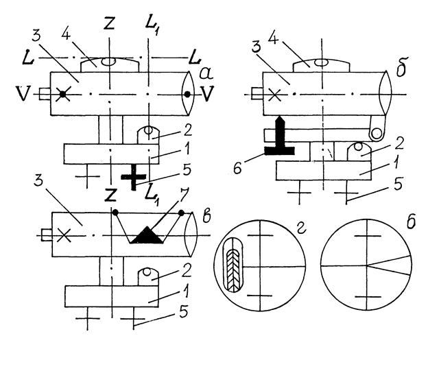 а – 1 подставка, 2 круглый уровень, 3 зрительная труба, 4 цилиндрический уровень. 5 подъемный винт; б – 1 подставка, 2 круглый уровень, 3 зрительная труба, 4 цилиндрический уровень, 5 подъемный винт. 6 элевационный винт; в – 1подставка, 2 круглый уровень, 3 зрительная труба, 5 подъемный винт, 7 компенсатор
