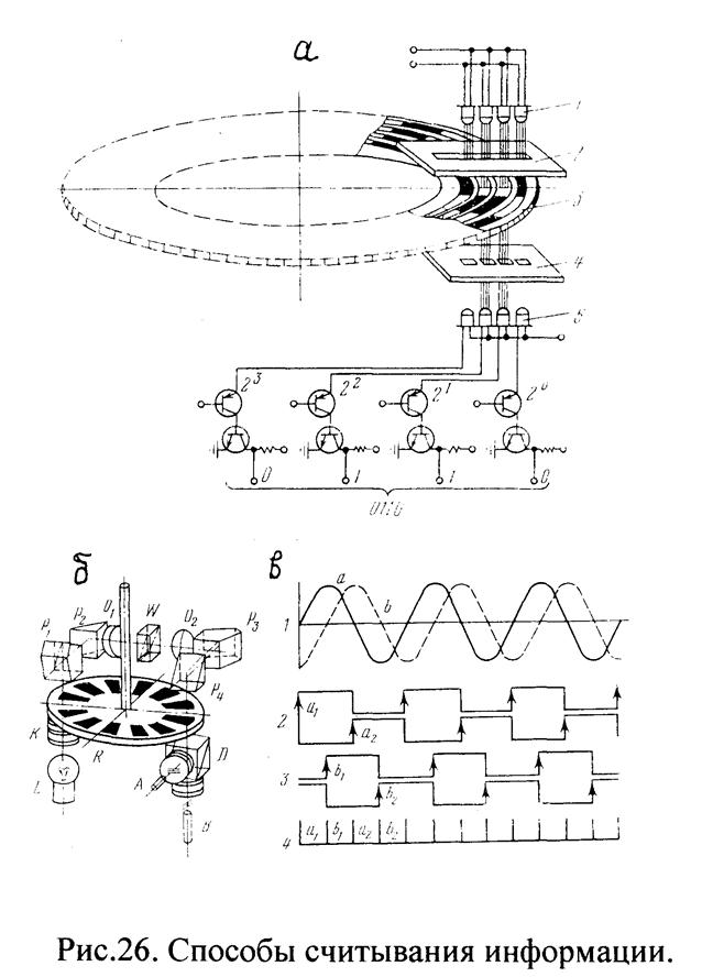 Считывание закодированной информации проводится с помощью механических, индуктивных, магнитных, фотоэлектрических преобразователей и электроннолучевой трубки. В геодезическом приборостроении более рациональными оказались фотоэлектрические преобразователи. Их работа основана на явлениях, возникающих при освещении или затемнении фотоэлементов. Кодовая маска в этом случае состоит из участков, пропускающих и не пропускающих свет, и наносится на стеклянные диски или линейки. В сущности, любой фотоэлектрический преобразователь (рис.26) состоит из источника света 1, ограничивающей 2 и считывающей 4 щелей блока фотоэлементов 5. Количество фотоэлементов соответствует числу дорожек кодового диска 3. Иногда для формирования более узкого пучка света используют цилиндрические линзы, устанавливая их между источником света и кодовым диском. От источника света через ограничивающую щелевую диафрагму проходит узкий пучок света, пересекающий маску в радиальном направлении. Прозрачные участки маски пропускают свет, который затем попадает на соответствующий фотоэлемент. На выходе фотоэлемента возникает сигнал, который может быть считан. Непрозрачные участки маски не пропускают света, поэтому на выходах соответствующих им фотоэлементов сигналов не возникает. Комбинация сигналов на всех фотоэлементах позволяет считать информацию в виде двоичного числа в определенном коде (на рис.26, а двоичное число 0110 соответствует числу 06 в десятичной системе счисления). Точность считывания информации с угломерных кругов (дисков) зависит от характера работ и колеблется в довольно широком диапазоне от 0,1" до 1'.
