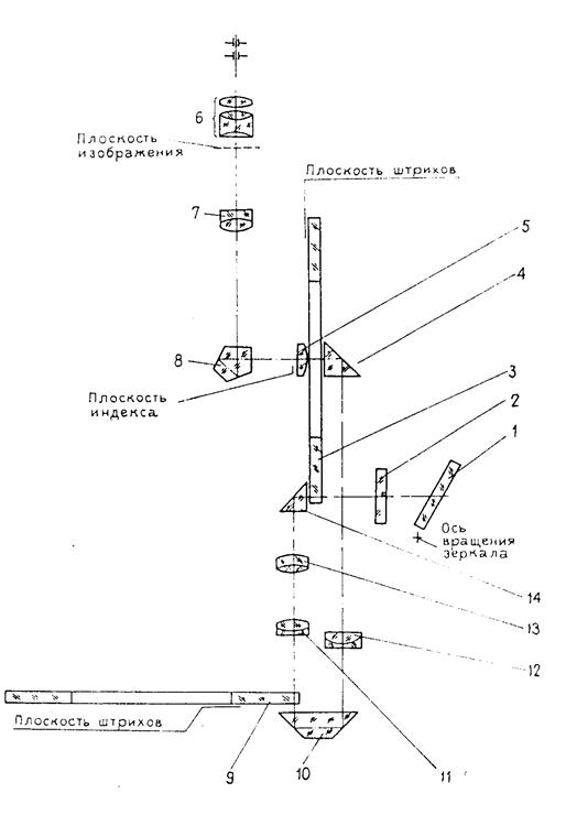 1 – зеркало подсветки; 2 – иллюминатор; 3 – вертикальный круг; 4, 10, 14 – призмы; 5 – коллектив с индексом; 6 – окуляр; 7 – объектив отсчетного микроскопа; 8 – пентапризма; 9 – горизонтальный круг; 11 – вторая линза объектива вертикального круга; 12 – объектив горизонтального круга; 13 – первая линза объектива вертикального круга.