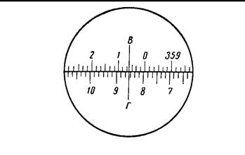 Штриховой микроскоп (микроскоп–оценщик) – это отсчетное устройство, в котором интервал между младшим штрихом лимба и индексом (дробная часть деления шкалы) оценивается на глаз до десятых долей деления лимба. В поле зрения окуляра микроскопа видны одновременно деления горизонтального (Г) и вертикального (В) кругов и отсчетного индекса. Отсчеты берутся по одной стороне круга и соответствуют приведенной выше формуле. На рис., а показаны отсчеты по лимбам
