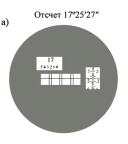 Перед отсчитыванием, вращая барабанчик микрометра, тщательно совмещают средние линии верхнего и нижнего изображений бинарных штрихов лимба горизонтального (или вертикального) круга. После этого записывают показания шкал. Если в верхнем окне видны два градусных числа, то рабочим является число, находящееся в пределах цифр десятков минут. Цифра, расположенная под серединой числа градусов (2 под 17), показывает количество десятков минут. К ним нужно прибавить единицы минуты (левый ряд цифр – 5), десятки секунды (правый ряд цифр – 2) и единицы секунды со шкалы микрометра (7). На рис. 24, в отсчет соответствует 17º25'27".
