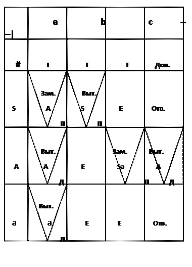 | Необраб. цепочка | Обр. симв. | Верхн симв магаз. | Содерж. магазина | Действие с магаз. | Действ. с вход. симв. |