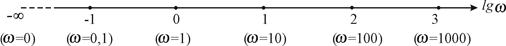 При построении логарифмических частотных характеристик по оси абсцисс откладываются значения частот в декадах. Декада – это интервал частот, заключенный между произвольным значением частоты wi и его десятикратным увеличением 10 wi. Отрезок логарифмической оси частот, соответствующий одной декаде, равен 1. Логарифмическая ось частот представлена на рис. 3.11.