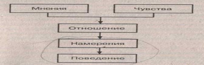 Отношение зависит от мнения человека относительно объекта отношения. Для ассоциации Волевой компонент, в отличие от познавательного и эмоционального, не используется в качестве двигателя отношений. Наоборот, считается, что сами отношения определяют волевые действия, т. е. тенденции поведения человека зависят от его (ее) отношения к объекту. Значит, тенденции потребителей к определенному поведению (например, приобретению продукта) должны возрастать по мере того, как их отношение становится более благосклонным.
