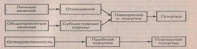 Модель Фишбейна и Айзена. В этой модели предполагается, что отношение к марке основывается на системе мнений о характеристиках марки (например, о соотношении «ценность/цена» и долго вечность). Эти мнения имеют ощутимые последствия, являющиеся результатом приобретения марки. Потребители придают разную степень важности тем или иным характеристикам, в зависимости оттого, какое мнение сложилось у них в отношении допустимого значения каждой из них. Характеристики, имеющие больший вес, и будут критериями выбора для данного человека и окажут определяющее влияние на формирование его отношения к марке.