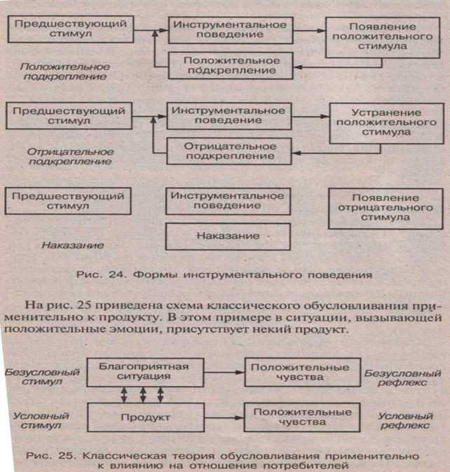 Инструментальное обусловливание рассматривает изменение поведения под воздействием подкрепления и наказания, обучение в результате наблюдения. Оно подчеркивает важность подкрепления как инструмента для оказания влияния на поведение потребителей. Уровень подкрепления, испытываемого потребителем при использовании продукта, в значительной мере определяет покупательское поведение. Фирмы часто предлагают потребителям дополнительное подкрепление в форме знаков внимания (подарков, благодарственных писем).
