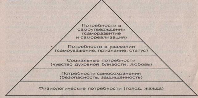 Теория иерархии потребностей Маслоу. Одна из самых известных теорий принадлежит Абрахаму Маслоу, выдвинувшему идею об иерархии человеческих потребностей. А. Маслоу делит потребности на низшие физиологические побуждения (жажда, голод), потребности в безопасности (жилище), аффективные потребности (любовь) и потребности высшего порядка — в самооценке и самовыражении (по сути, это потребность человека выразить лучшее, что в нем есть).