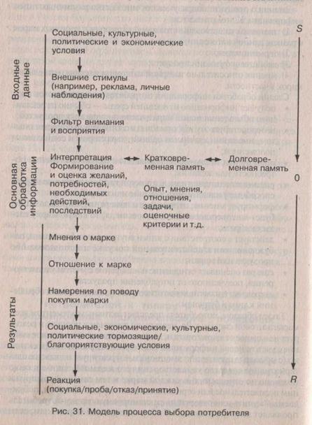 покупка не состоится, отказ от рассмотрения данных марок) — результат мысленной установки, обязательно предшествующей выбору. Модель процесса выбора потребителя приведена на рис. 31.